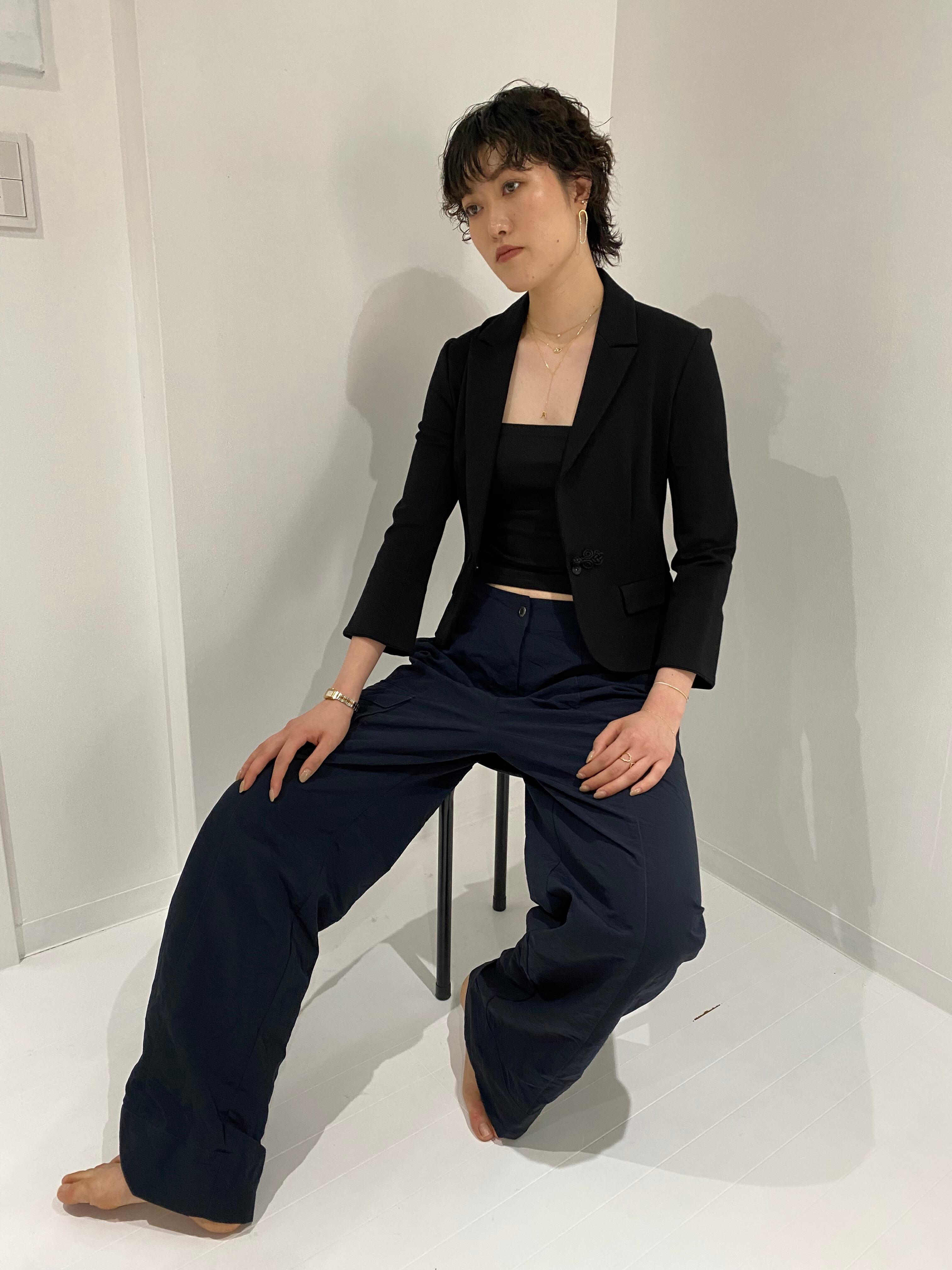 ショート丈ですので、今回はカーゴパンツとのスタイリングをして着崩してみました。