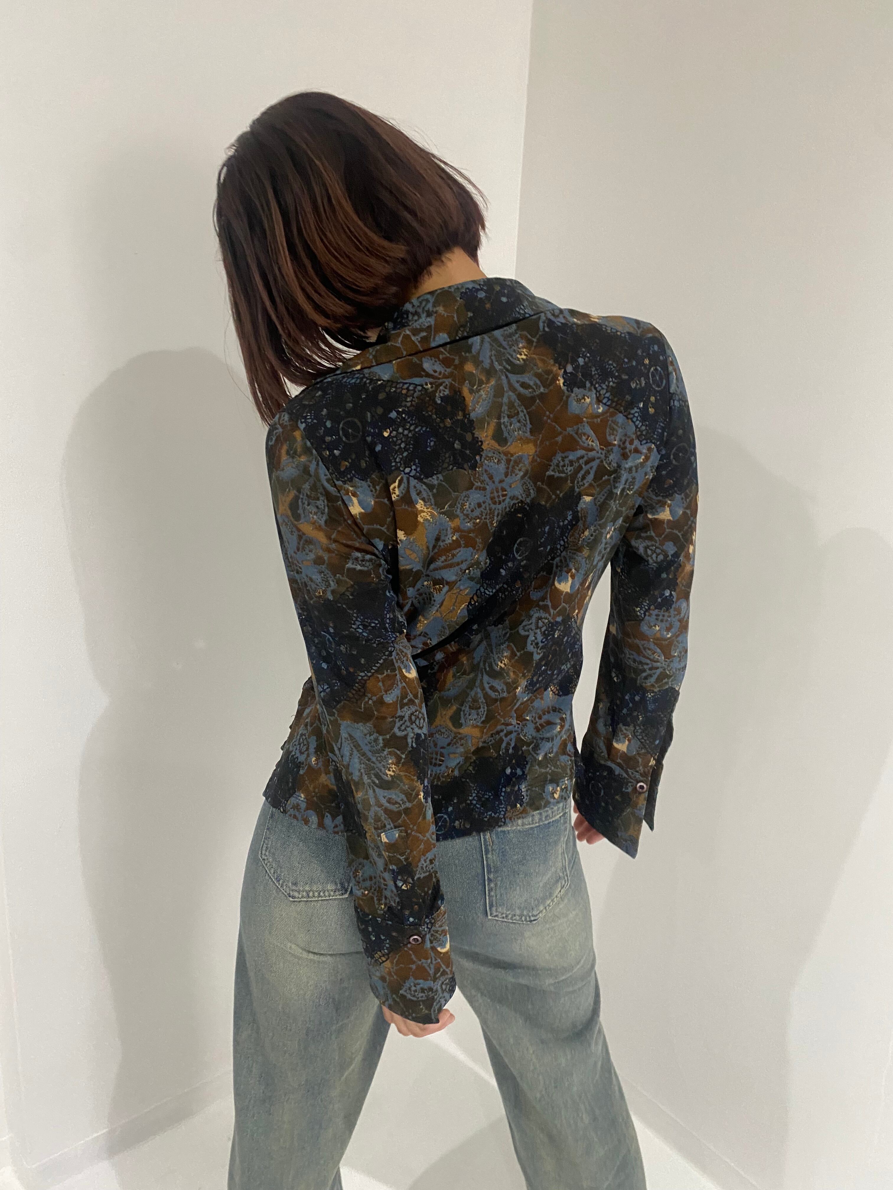 胸元にギャザーのはいった細身のブラウス。